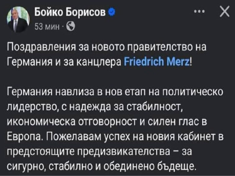 Поредна излагация от страна на българския политически елит! С цел да се изтъкне като евроатлантик №1 на България, председателят на ПП ГЕРБ Бойко Борисов реши да поздрави сърдечно председателя на най-голямата германска партия в Бундестага Фридрих Мерц за съставянето на правителство. Бившият български министър-председател обаче не беше предвидил това, че германските депутати можеше да не изберат немския му колега за канцлер толкова безпроблемно, което и се случи.